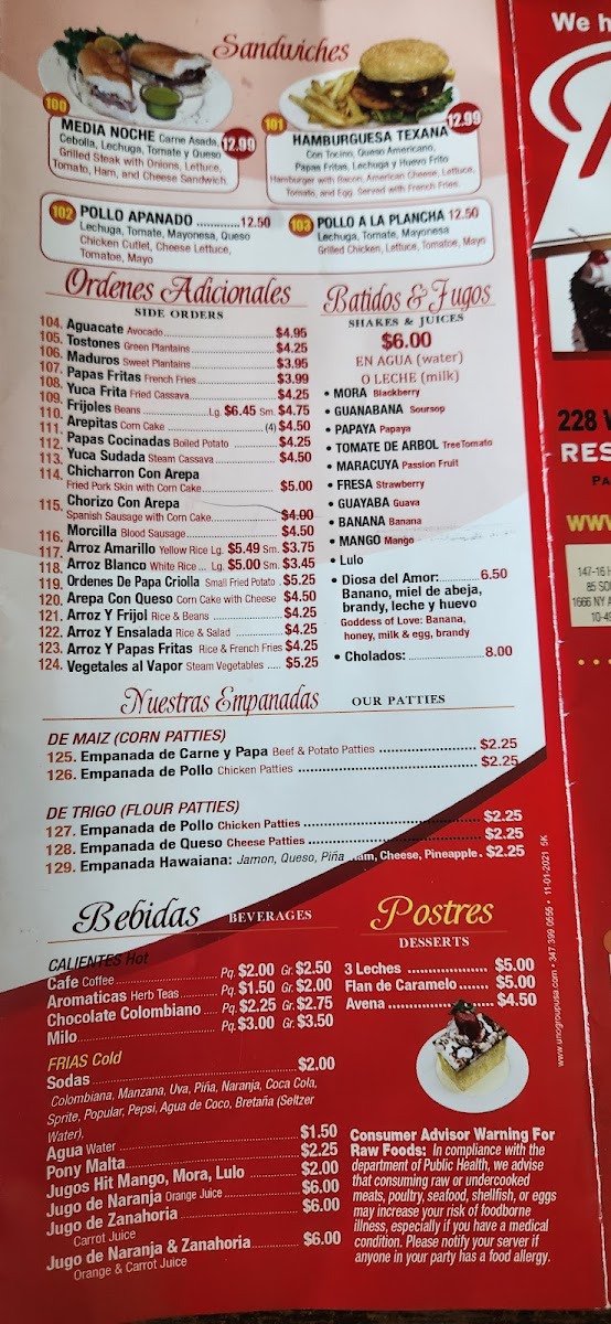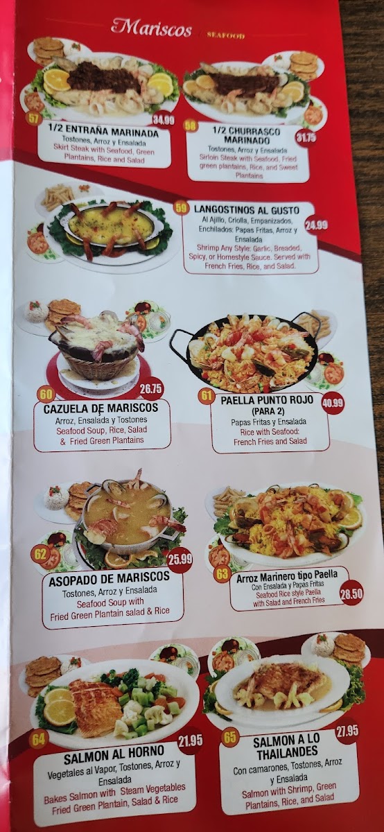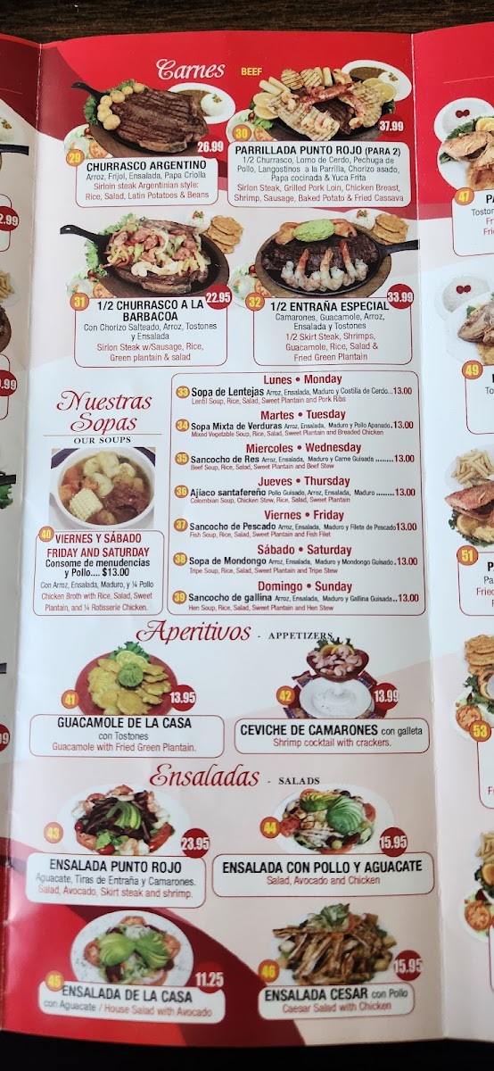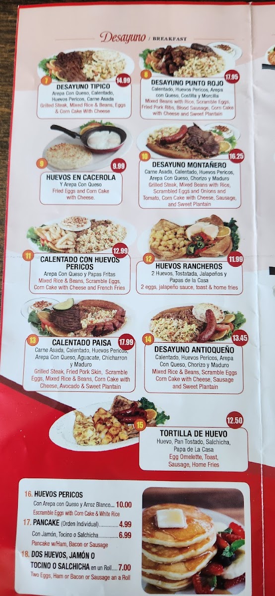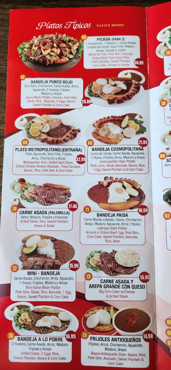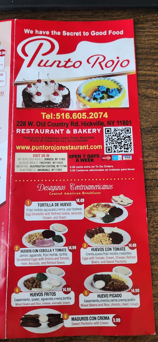 The menu at Punto Rojo Bakery Hicksville 2 offers a variety of traditional Colombian dishes and baked goods, organized into distinct categories to cater to different meal occasions. Guests can find options suitable for breakfast, light meals, and casual dining.